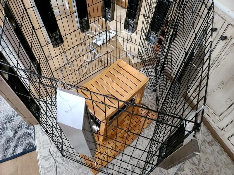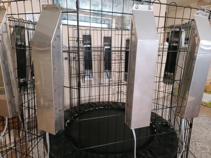 My rebounder in the sauna. Just a dog cage I bought on Craigslist and the visceral heaters. I want the infrared rays from the heaters, not the heat.